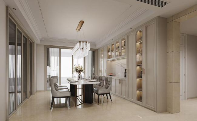 以素為美: 素色是時光的底色,擯棄艷麗,褪去浮華。地面的微光磚通鋪,空間與空間再無輪廓,一家老小再無距離;天花及墻面的微水泥粗糲而沉靜,留下了歲月的斑斑點點;混油的柜門,包裹著南美櫻桃的芬芳,樸實無華,外陋慧中;亞麻的窗紗、泰迪絨的窗布、家私,盡是姑娘的素顏;當目光掠過這些素凈的載體,心也隨之沉靜,在天地墻純粹的底色里,照見生命最淳樸的模樣。 以真為美: 真,是萬物最原始的狀態(tài),是逐漸遺失了的美好。在這里我們保留材料的原生肌理,水泥的顆粒、木材的疤結(jié)、織物的經(jīng)緯,皆不做刻意修飾。尤為是粗糲的洞石餐桌,在工匠手中蘇醒,鑿痕交錯的邊界如時光刻下的古老圖騰,天然氣孔殘留石面,那是石頭原本呼吸的樣子;電視背景與立柱亦被手工開鑿的原石包裹,未加修飾的斑駁肌理,讓冰冷石材褪去工業(yè)的桎梏。當觸摸到粗糲的墻面,嗅到原木的清香,便能感知到自然的溫度,唯有真實,才能穿透表象,抵達內(nèi)心最柔軟的角落。 以枯為美: 干枯并非終結(jié),而是時間風(fēng)化攜刻在物體的印記,它褪去了盛放的張揚,沉淀出內(nèi)斂的風(fēng)骨。床頭的胡桃木,三尺六的直徑,曾經(jīng)也是參天大樹,如今褪去再加工,倚靠在這碩大的年輪上,共同領(lǐng)悟生命的真諦;木地板的疤結(jié),大概是保留了每個個體的生長歷程,展現(xiàn)了大自然的鬼斧神工,與腳底的每一寸肌膚接觸,在這里留下了屬于自己的記憶;藤條斜倚陶土瓶,在燈光的映襯下,地面的投影清晰可見,微風(fēng)拂過,輕輕擺動,這便是傳承、便是輪回。 以寂為美: 寂既缺,打破了刻板的圓滿,注入想象的空間。正如人生總有遺憾,而這些遺憾,恰如古畫的飛墨,是歲月贈予的詩意,在塑造殘缺時,試著讀懂萬物的深意。玄關(guān)的半月,用樹脂還原月球表面的隕石坑,折射著微微的燈光,便是回家的第一縷溫情;廊道上的壁燈,是設(shè)計師與業(yè)主親手開鑿的小驚喜,深淺不一的鑿痕,每一道都是與房子對話的印記,當暖黃的燈光從洞隙灑出,仿佛又看到了新生;品茶區(qū)的茶臺如歲月將老木雕琢成詩,那些皸裂的紋路里藏著時光的絮語,將它們重新拼合,注入晶瑩剔透的現(xiàn)代樹脂,宛如引入一泓靈動的小河,流淌在茶臺之上,在這一方新舊交織間,無聲訴說著源遠流長。