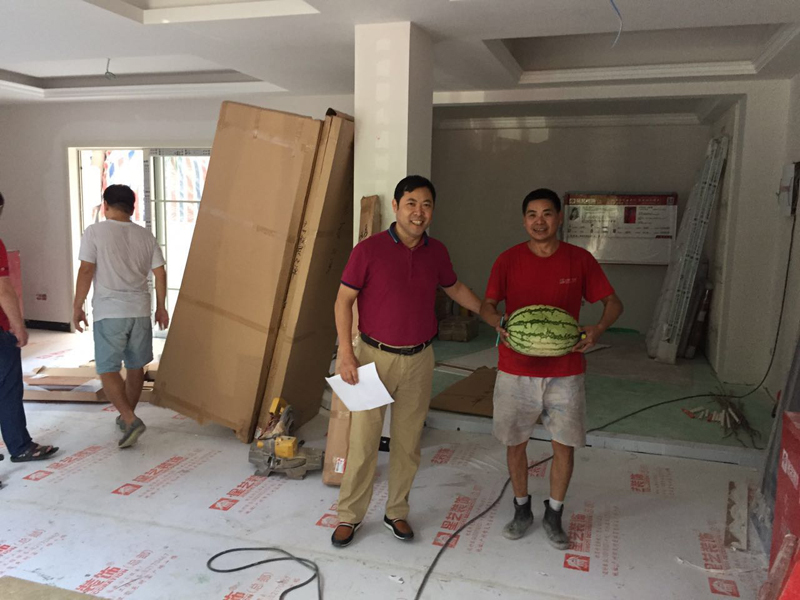 在這驕陽似火,赤日炎炎的天氣,柯總一行人來到了保利花園。持續高溫的天氣下,工地開啟了“蒸煮模式”,為了每個業主的新家,工地的裝修師傅們揮汗如雨,冒著酷暑打線槽、鋪電線、貼地磚……柯總把水果飲料親自送到每一個裝修師傅的手中,對在酷暑高溫下抓緊施工的工人師傅們表示感謝。并叮囑大家在確保工程質量,安全高效的推進工期同時,也要注意在高溫下工作的自我防護。