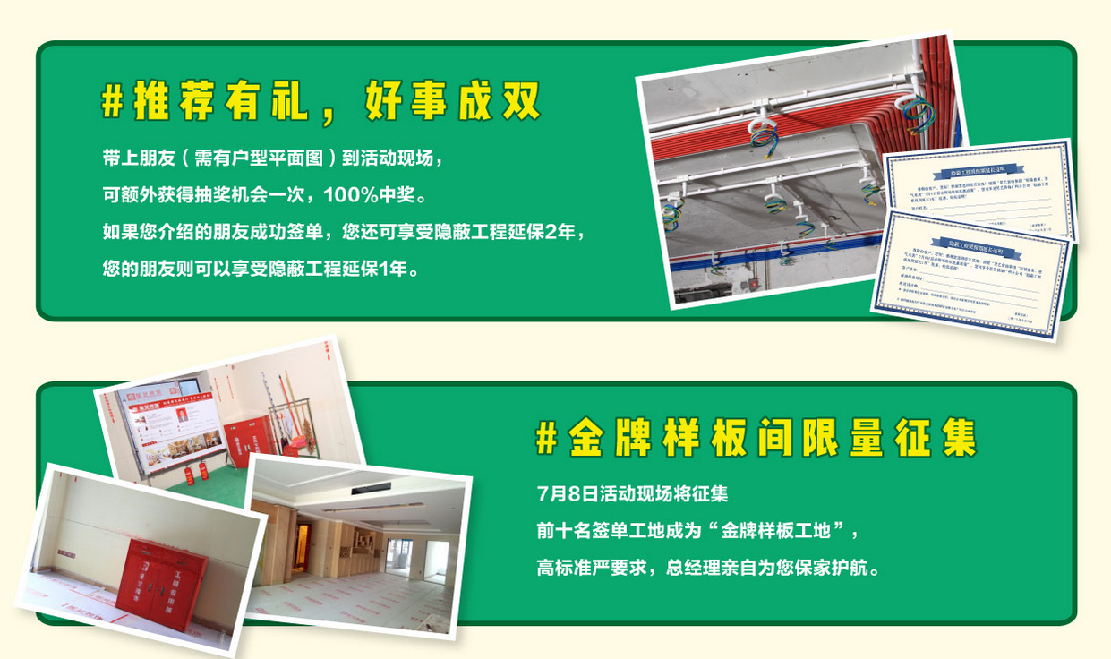 與好伙伴同享好禮,就是節日的意義。那么,這次驚喜大禮怎能不告訴你身邊的小伙伴呢。推薦好友成功簽單,豪禮翻倍。7月8日活動現場推薦好友成功簽單,您 即可享受隱蔽工程延保2年,您的朋友 也能享受隱蔽工程延保1年。好品質,值得分享。