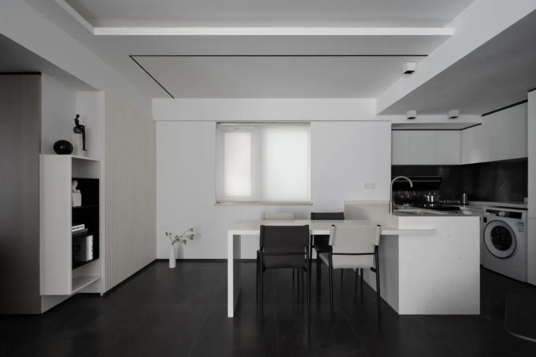 在承載了重要生活場景的餐廚區域,設計師直接把玻璃門和墻體打掉之后,開放式廚房搭配島臺設計,將整個餐廚空間融為一體,顯得通透、明亮。通過輕松簡約的造型與黑白灰的色調來呈現空間里的都市感。
