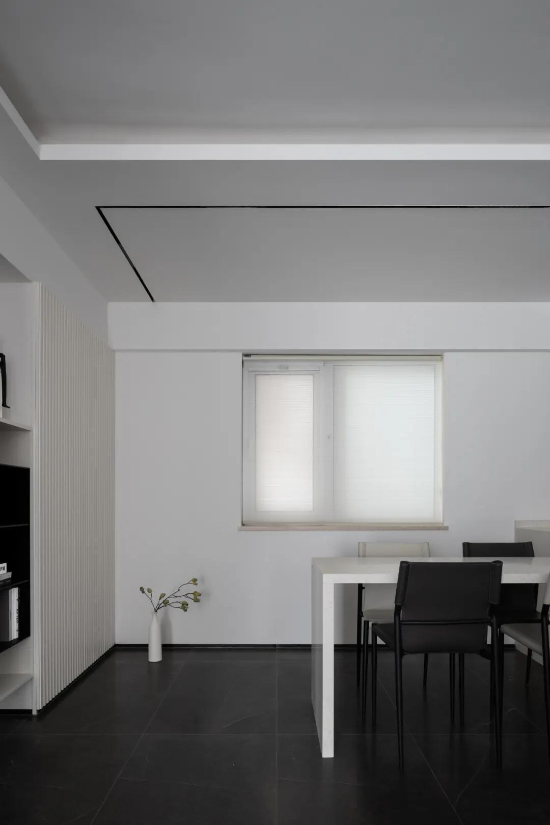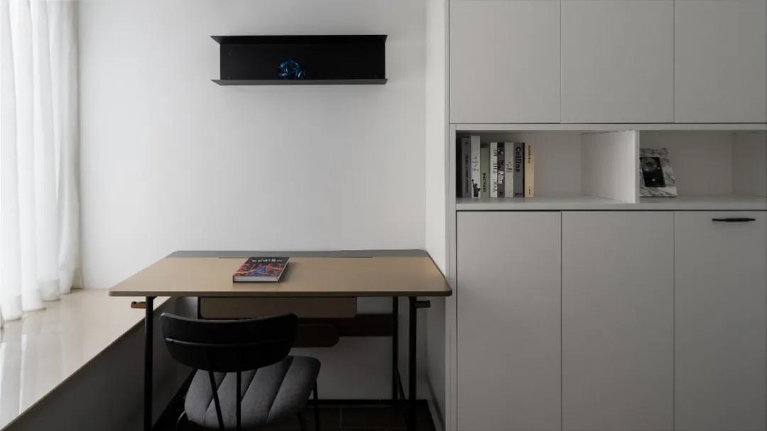由于房子層高還不到2.6米,客廳與書房之間的墻面留出長條形窗口作為連通,從書房看出去,交錯視線,讓整個空間有深遠不盡的感覺,虛實之間趣味倍增。