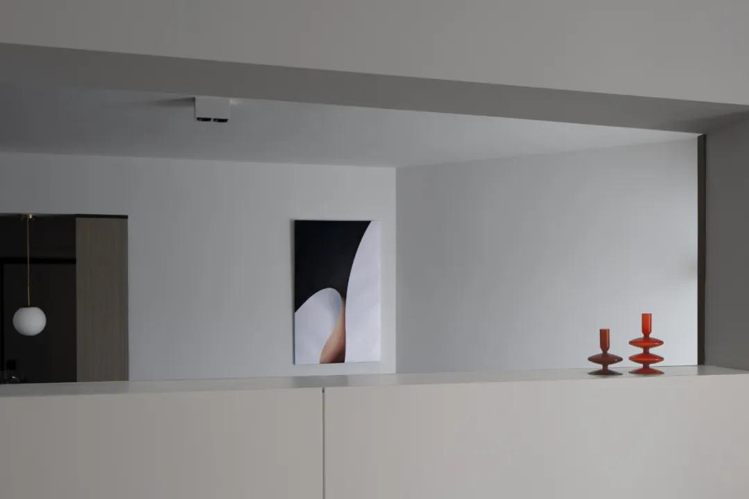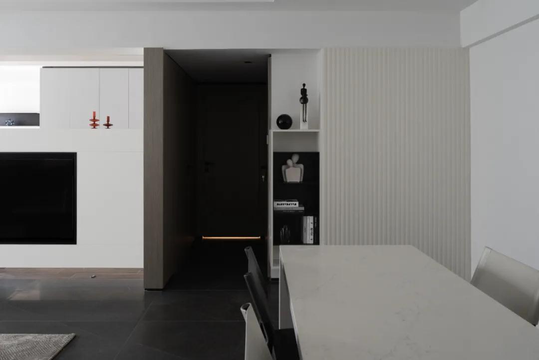 小小的框景設計消除封閉式玄關設計易產生的笨重感,既豐富了視覺層次,也保證了入戶通道的采光。玄關與室內空間的相一致的形體感,兼具功能性與藝術性,提升了空間的審美層次。