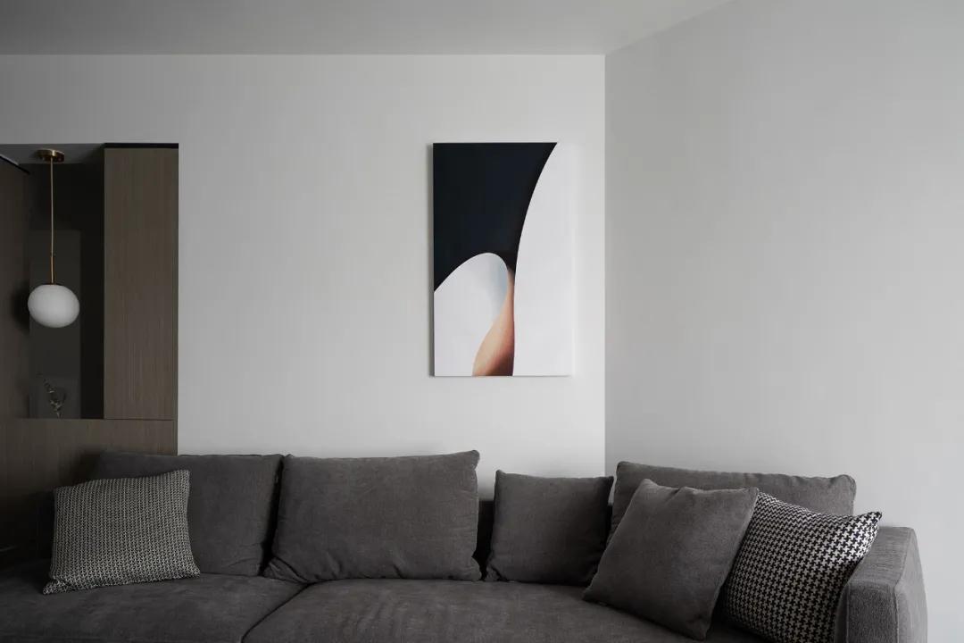 設計師選擇拐角沙發弱化了客廳異型結構,完美解決鉆石角所造成的尖銳感,變缺陷為亮點。墻上的抽象畫為整個空間增添了藝術的氣息,給原本稍顯寡淡色調加了精彩的一筆。