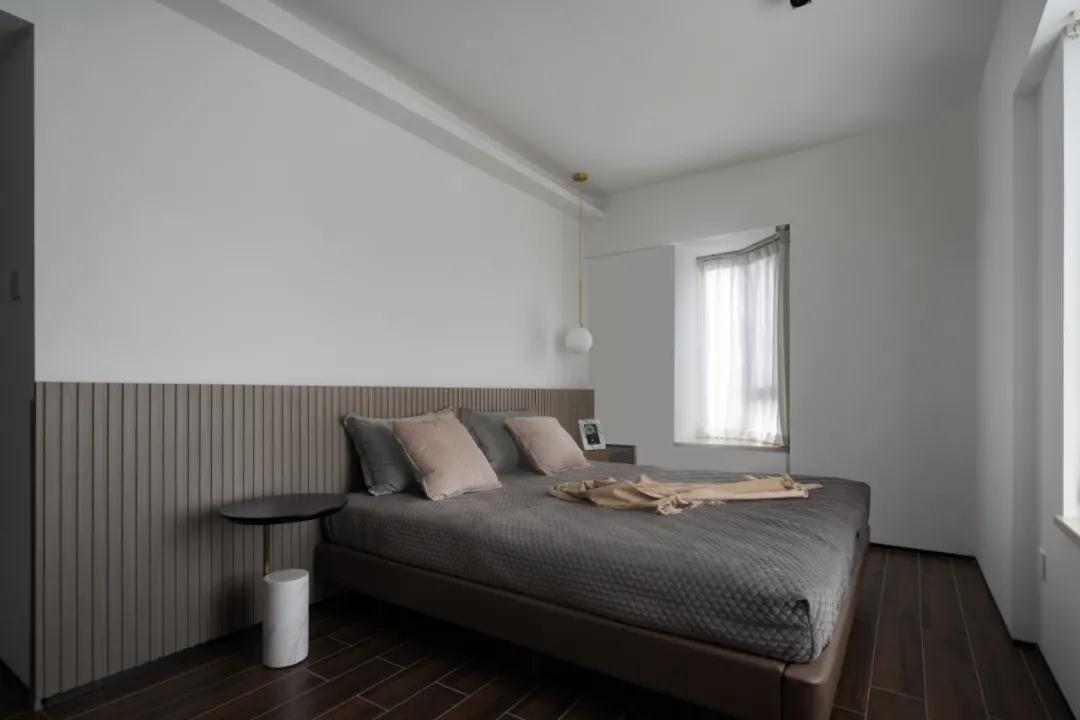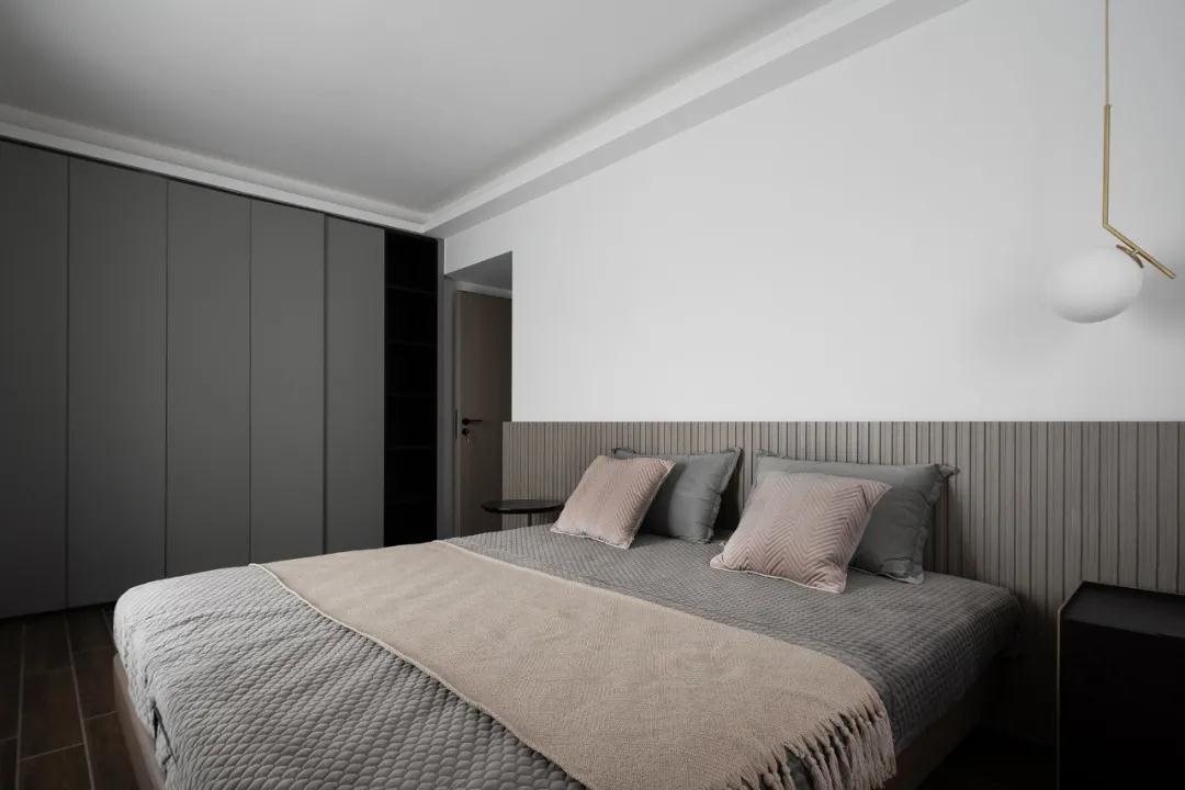 主臥就設計比較簡單了,床靠后以半墻條紋型的護墻板做裝飾,在簡潔的空間中點綴以適當的肌理細節,濃淡相宜。