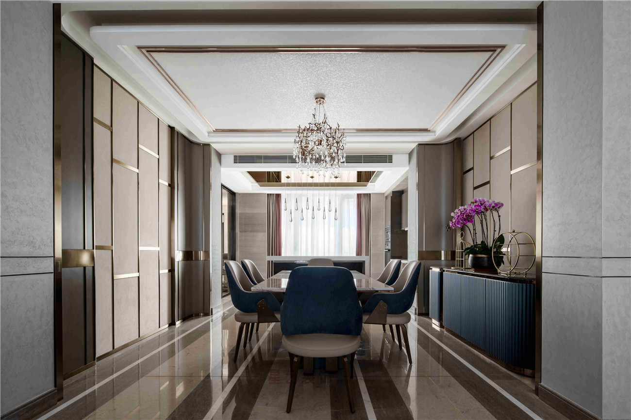 用餐區(qū)則把輕奢主義發(fā)揮到及至,首先就是金屬質(zhì)感的鑲嵌紋理,和富麗堂皇的水晶燈,都是業(yè)主最愛(ài)的元素之一,為即將入住的新婚夫妻帶來(lái)滿滿的浪漫氣息。