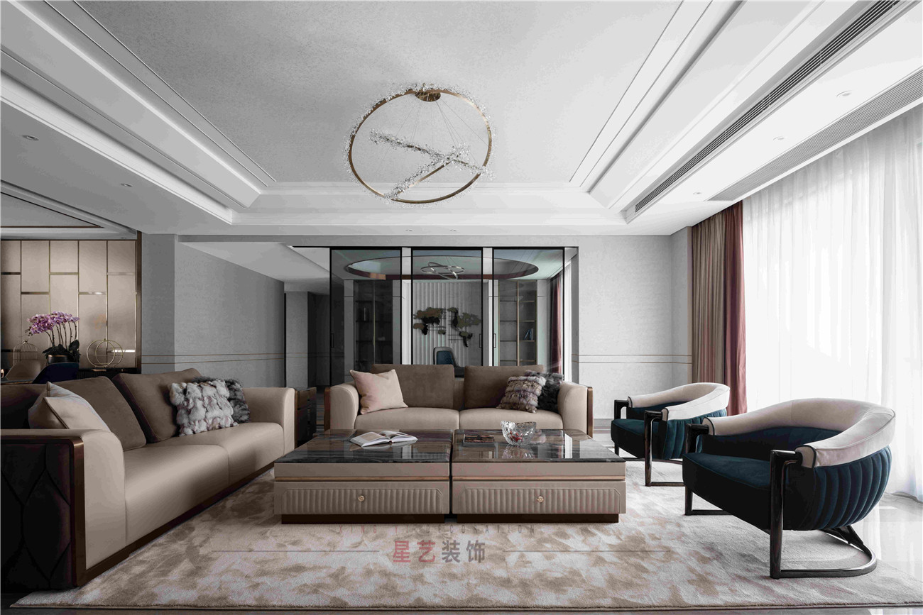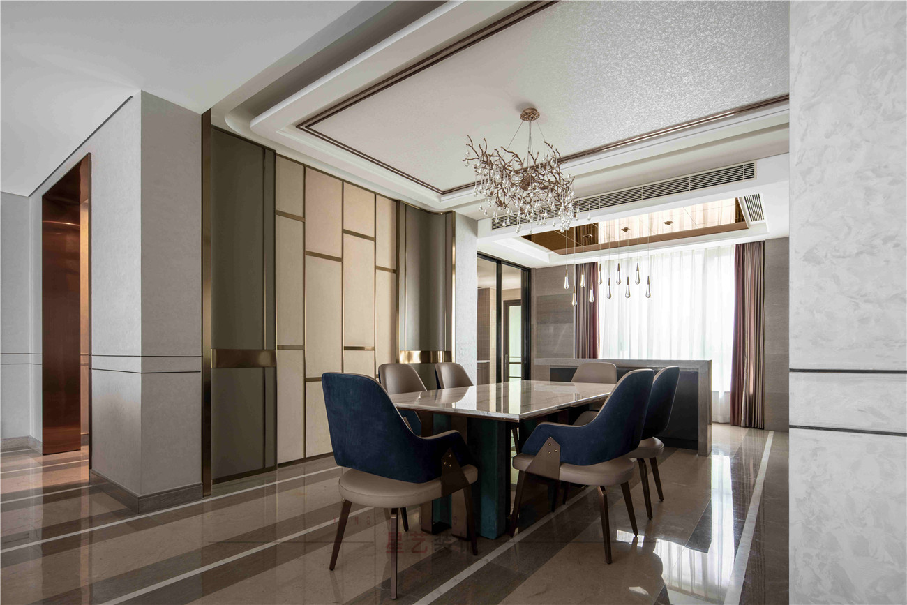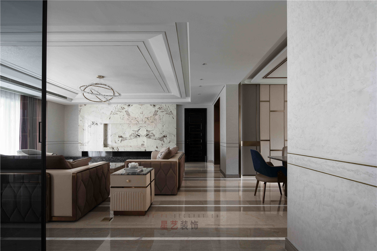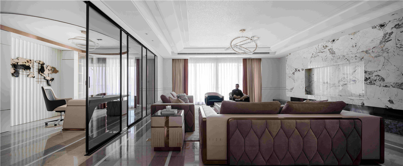 本案設(shè)計(jì)是位于海珠區(qū)380㎡的住宅,擁有無(wú)敵景觀一視野,業(yè)主90后,準(zhǔn)備做婚房,要求輕奢,鐘愛(ài)石材,金屬和皮質(zhì)的家居風(fēng)格,敞開(kāi)式書房通過(guò)隔斷可移動(dòng)屏風(fēng)于客戶區(qū)域串聯(lián)起來(lái),可開(kāi)可隔斷的靈動(dòng)組合,最大的強(qiáng)化空間包容及開(kāi)闊性,用中西結(jié)合的方式為即將到來(lái)的婚姻生活帶來(lái)更高的幸福指數(shù),打造溫馨的生活環(huán)境。