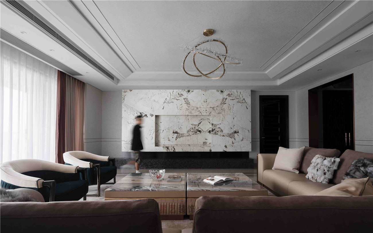 光滑有質(zhì)感的沙發(fā),搭配上同色系的矮桌讓整體的色調(diào)更加協(xié)調(diào),而且?guī)в谢⌒蔚纳钌q面座椅,和精心設(shè)計(jì)的圓形吊燈,打破了四四方方桌子和沙發(fā)帶來(lái)的頓感,如潑墨山水般的人大理石紋理給整個(gè)客廳增添奢華的格調(diào)。