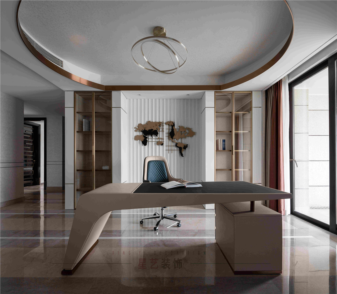 想要過(guò)上向往的生活,工作就顯得總是無(wú)處不在,辦公區(qū)是在家中辦公或者看書的地方。這樣充滿的科技感的辦公桌就備受年輕人的喜愛(ài),尤其是跟客廳相呼應(yīng)的圓形吊燈和棕色邊框的修飾,直接把整體的時(shí)尚度拉滿,同時(shí)寬闊獨(dú)立的空間更是減緩了工作壓力帶來(lái)的壓迫感。
