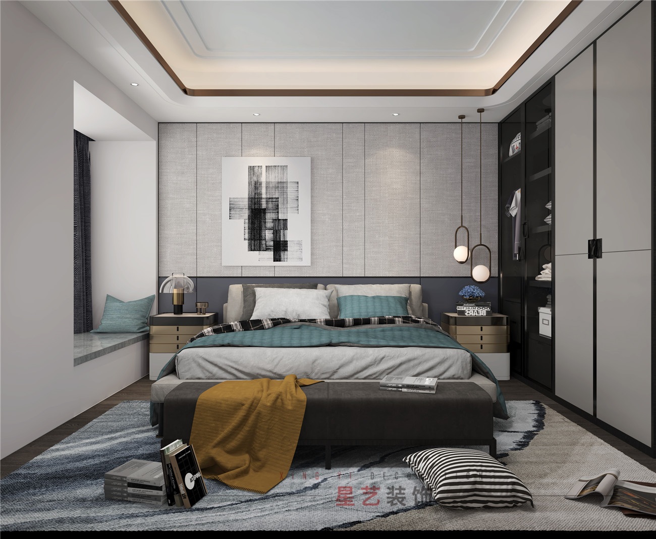 效果圖和實景圖中的主臥都用了大量的對稱元素,墻面,衣柜和天花板都有用到對稱的手法,效果圖整體色調(diào)偏向黑白灰,用橘色做點綴,簡約又不平凡。