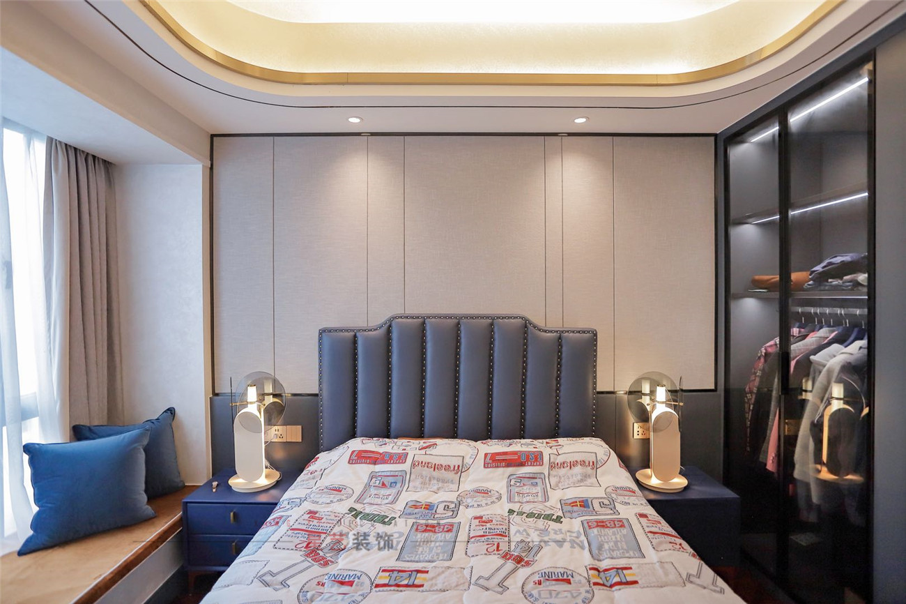 男孩房的實景中則是用了看藍色調(diào)做渲染,被子的英文海報圖案和設(shè)計干臺燈增加了臥室的潮流感,也有用到對稱的元素,大氣簡約。
