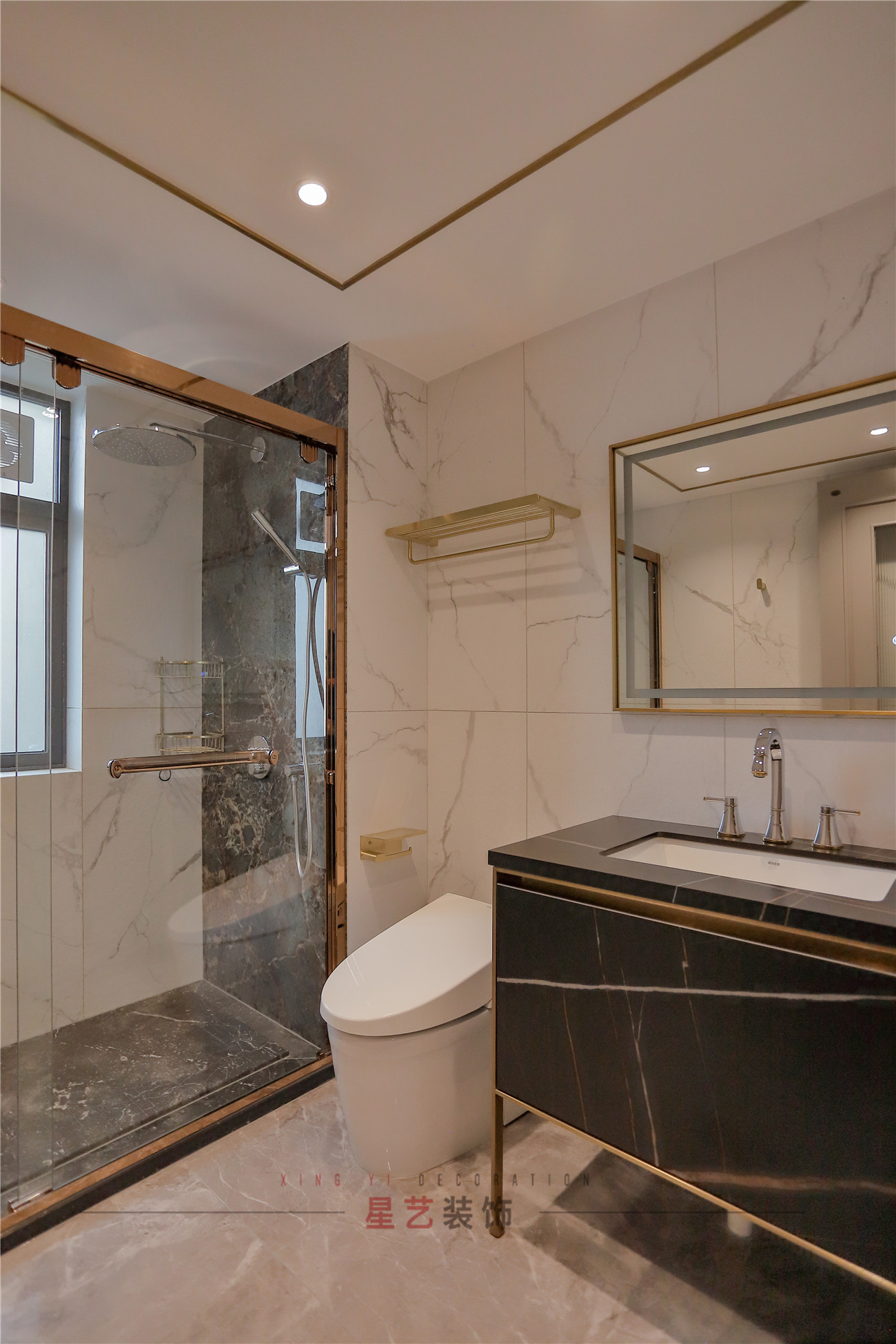 浴室主要采用淋浴的設(shè)計,隔間設(shè)計做到了干濕分離的效果,金邊設(shè)計讓整體風格奢華而又不會太過浮夸,讓每天回家得生活都能在最放松的環(huán)境里卸下一天得疲憊。