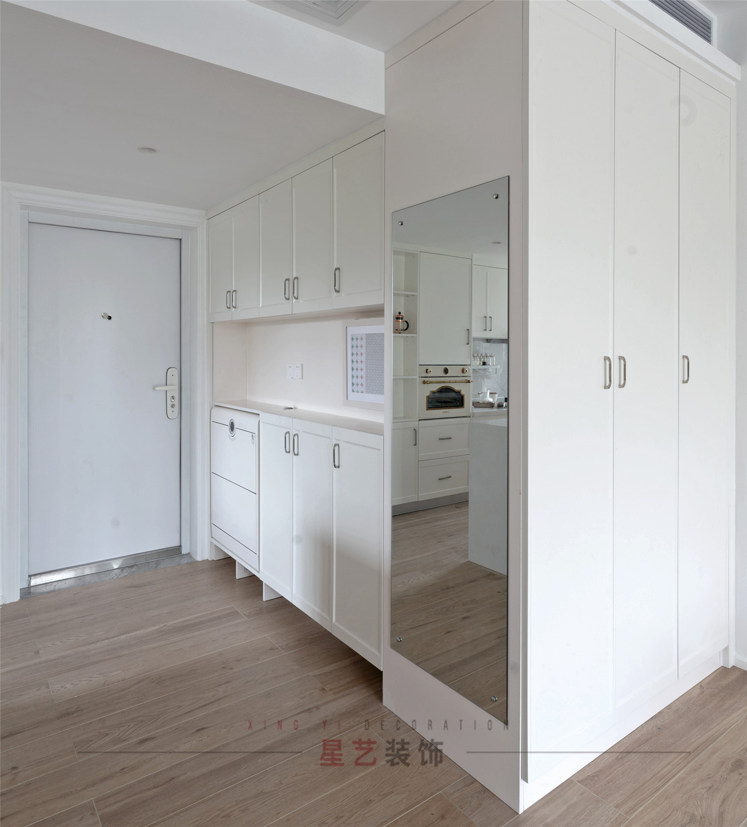 玄關(guān)雖然占地面積小,卻是每天的必經(jīng)之地,超大的容量的儲物柜具有強(qiáng)大的功能性與實用性,底部留空的設(shè)計方便打掃又能放日常更換的鞋子,干凈整潔。