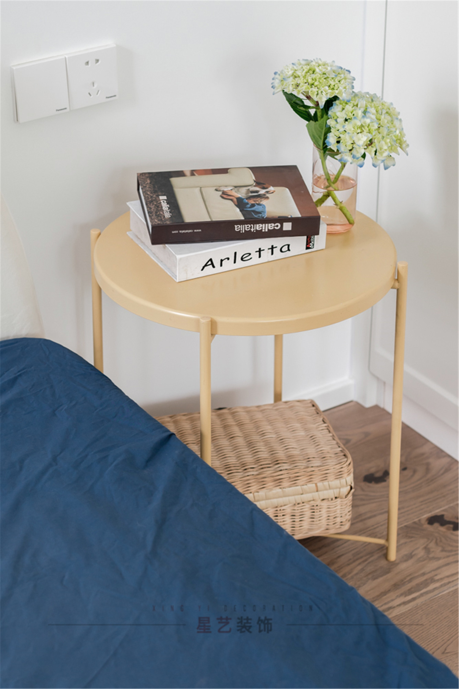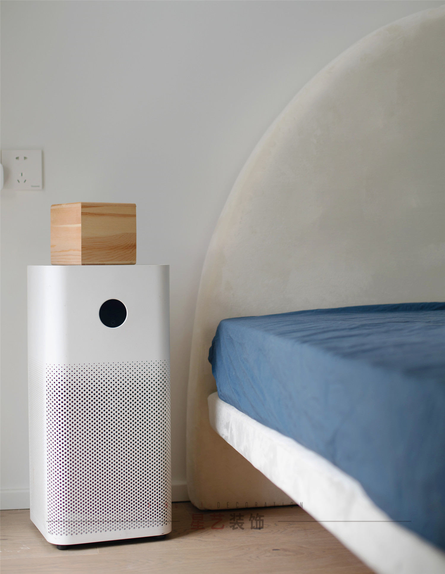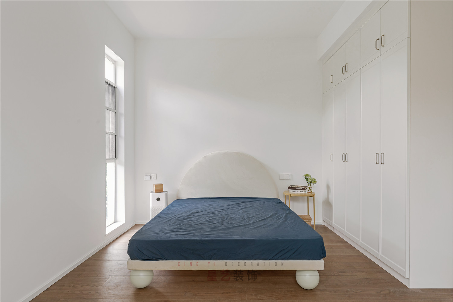 臥室在床頭的位置設(shè)計了小面積的落地窗,打破整體白色帶來的空曠感,增加層次關(guān)系。半圓形靠背搭配藍(lán)色床墊,仿佛置身于海上明月的光景中,給人帶來無限遐想