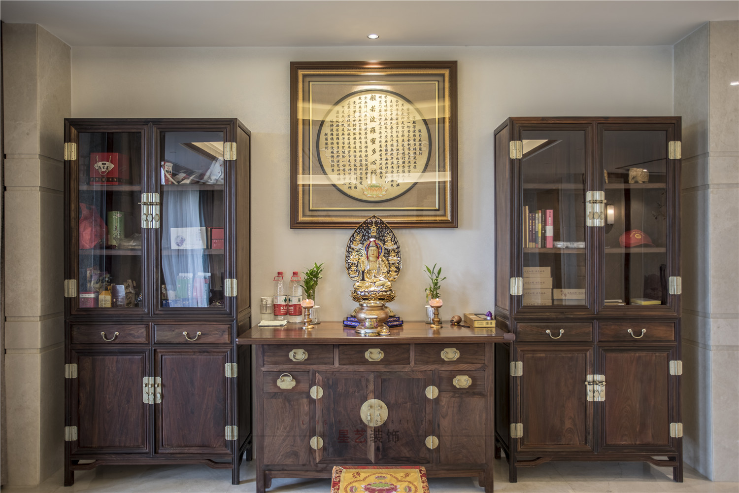 香案兩邊就是置物柜,每天都可以靜下來心來讀經(jīng),靜坐。兩兩對稱,四平八穩(wěn)的長桌置物架放一對木雕大象擺件,在傳統(tǒng)文化中,象與祥字諧音,因此象也被賦予了吉祥的寓意。