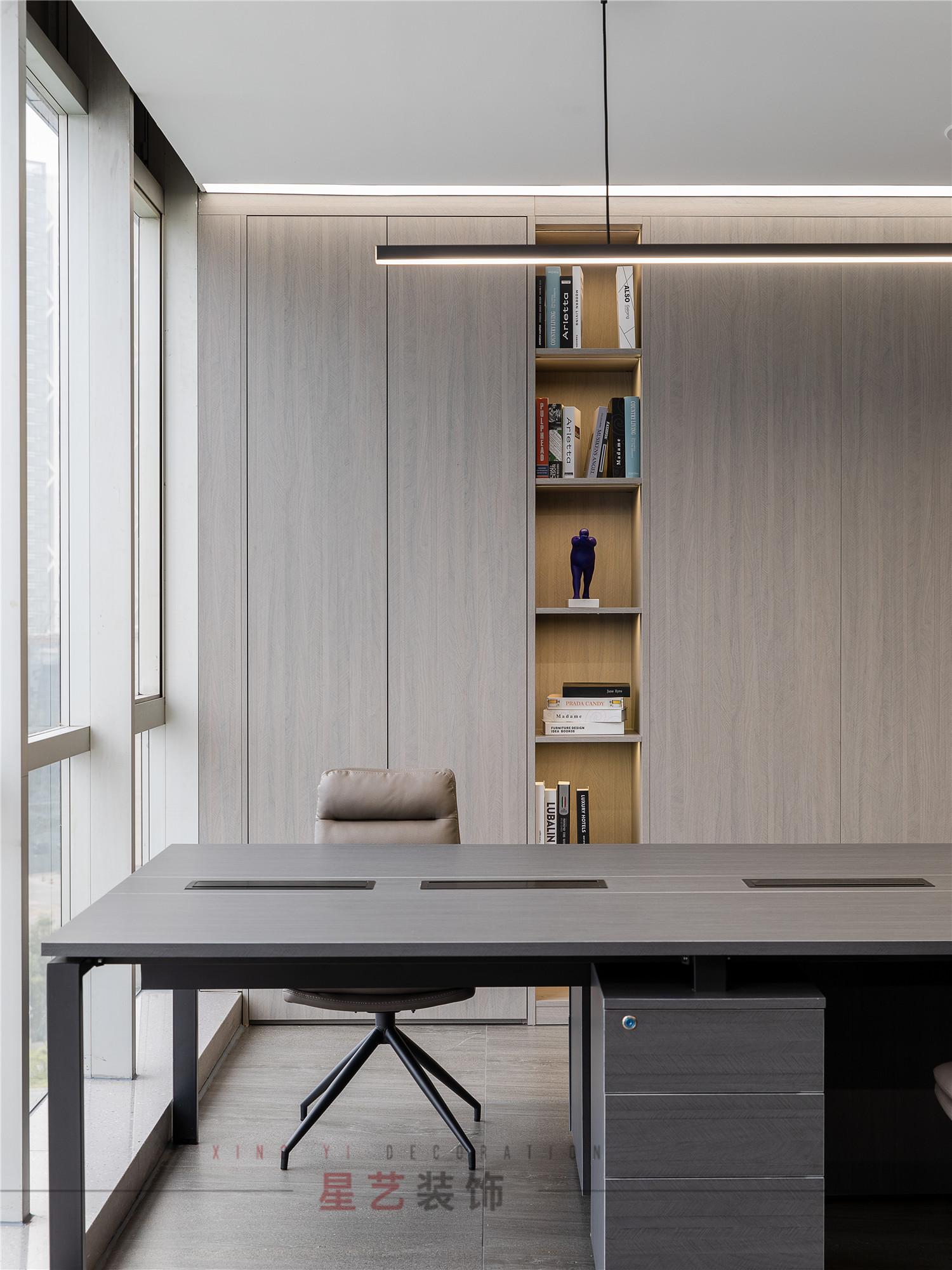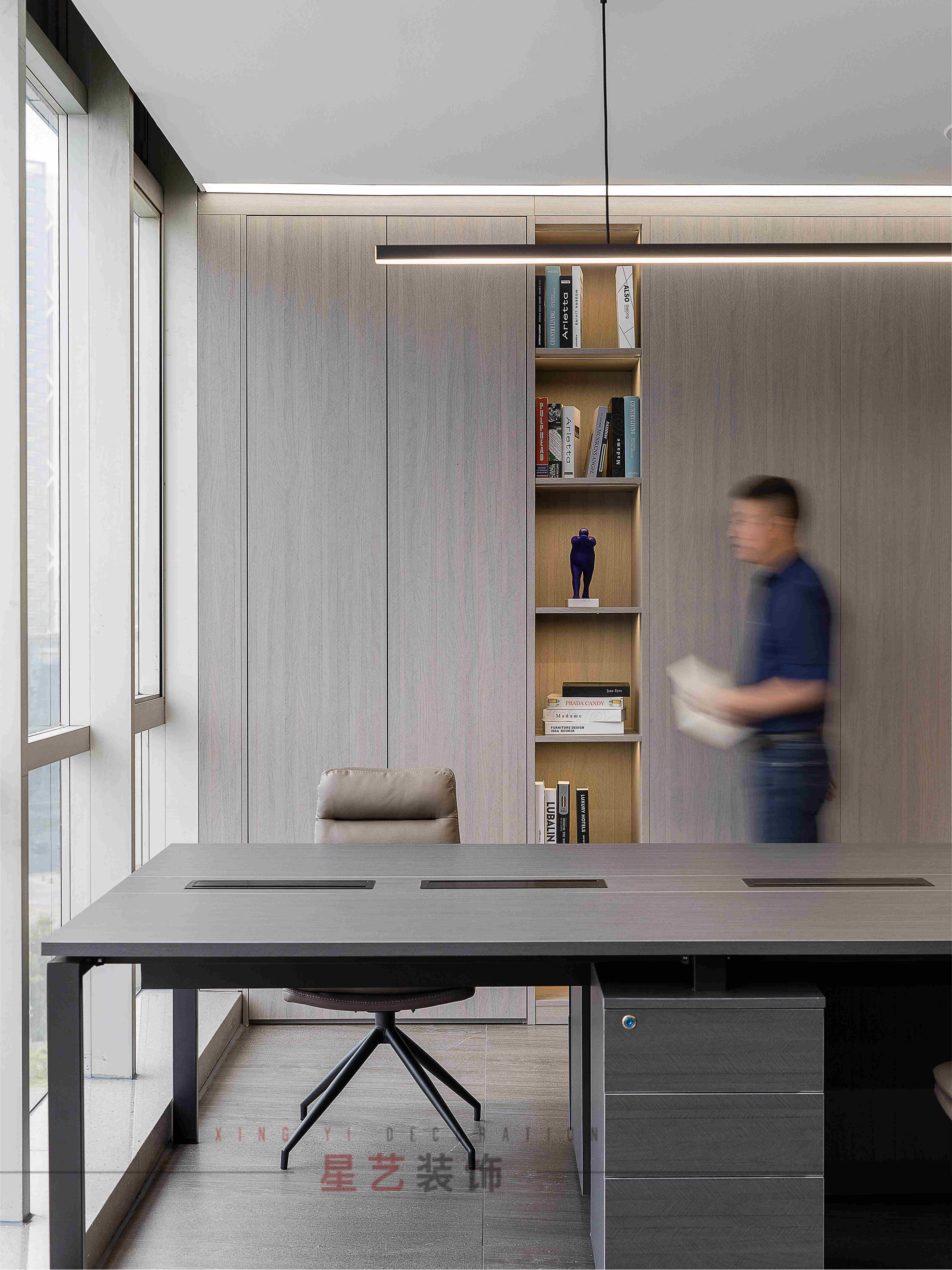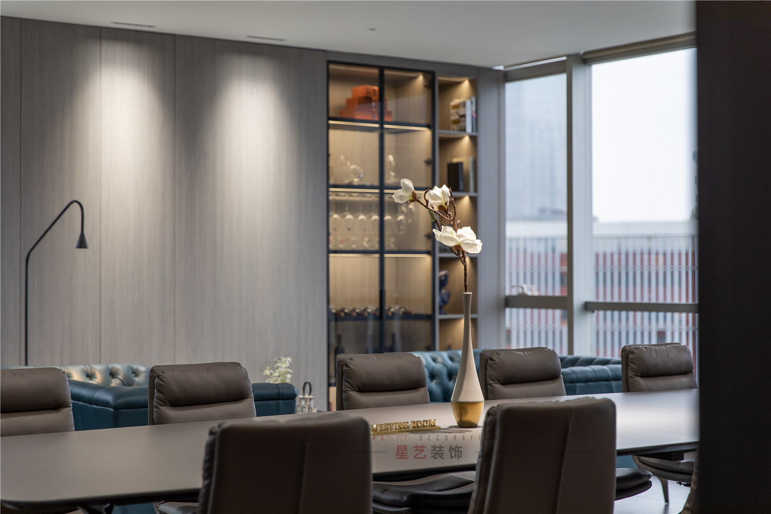 會議區也可作為接待區,休息區,學習區,隱形儲物柜實用又美觀,整面的落地窗讓整個空間干凈明亮,既能享受家的愜意,也能減少工作帶來的的浮躁與不安。