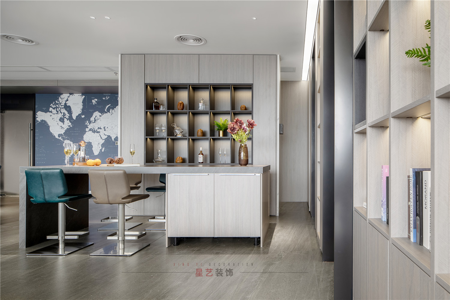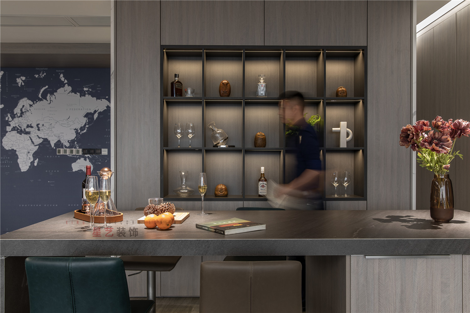 水吧部分直接設計了酒水柜,并且暖色的燈光直接把氛圍感拉滿,在休息時間也能感受溫馨浪漫的環境。