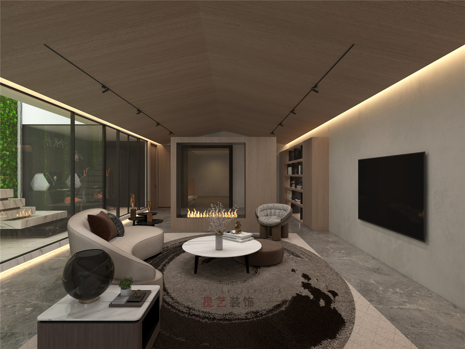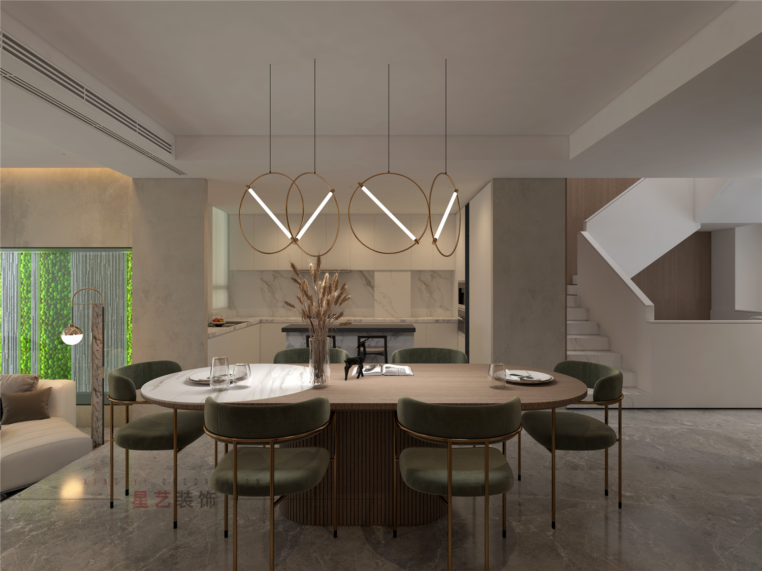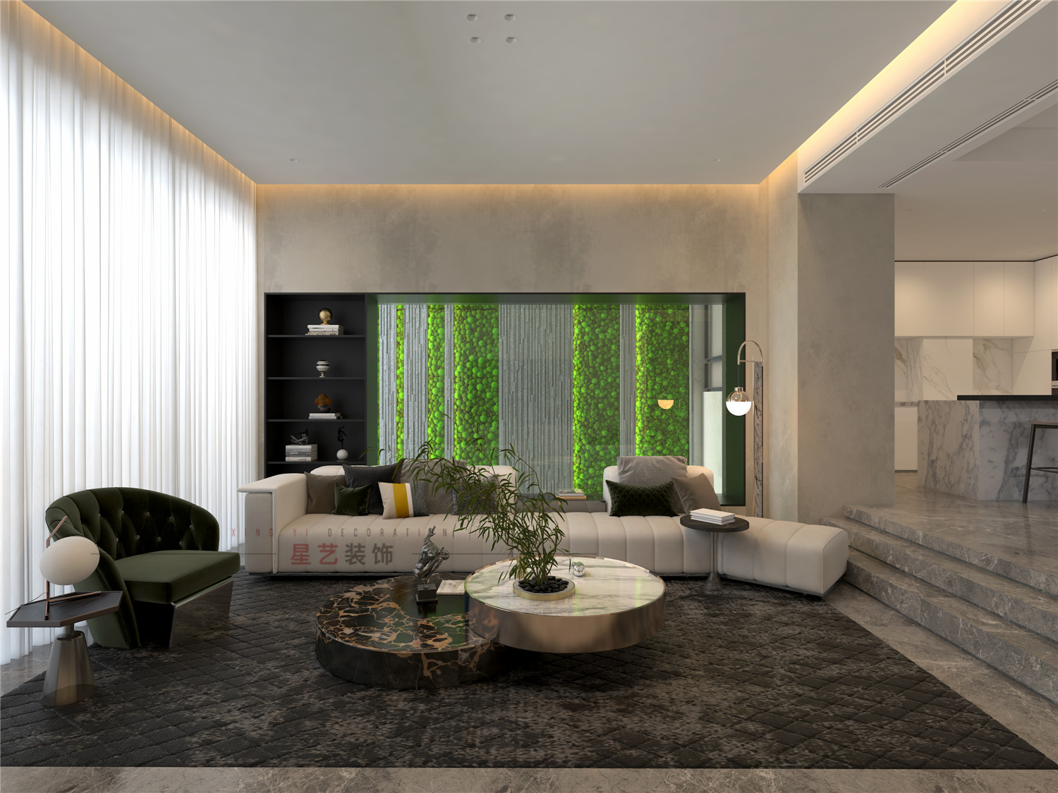 綠植裝飾貫穿兩層客廳的背景;