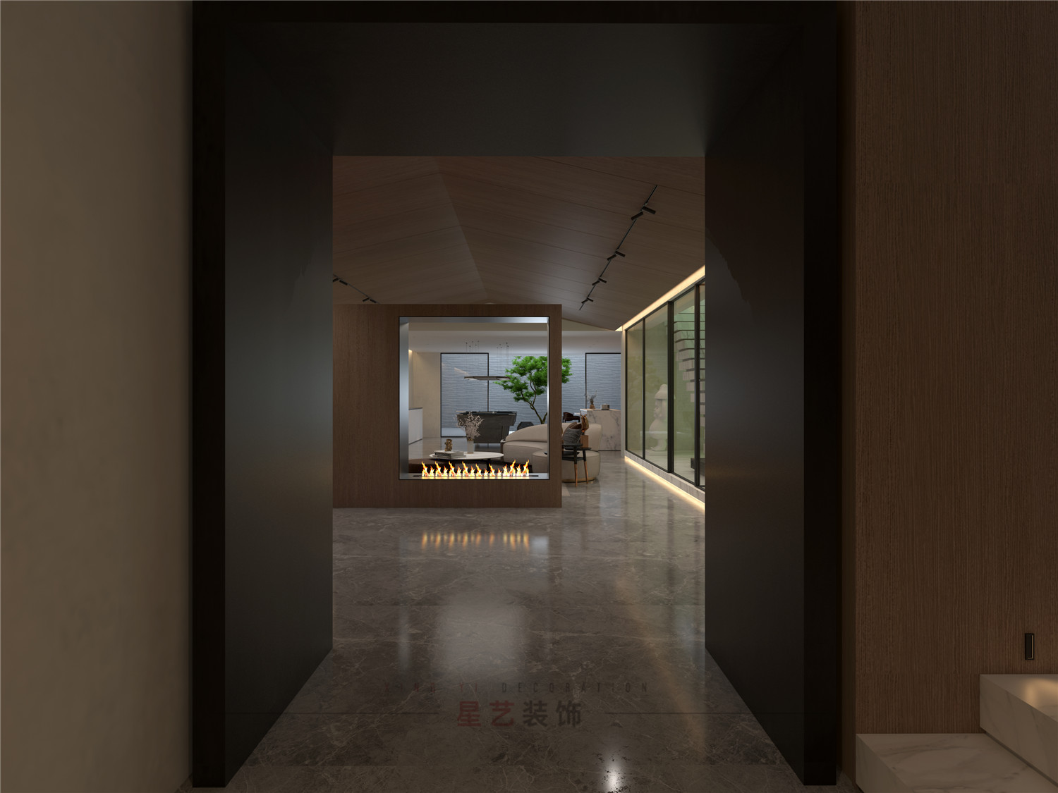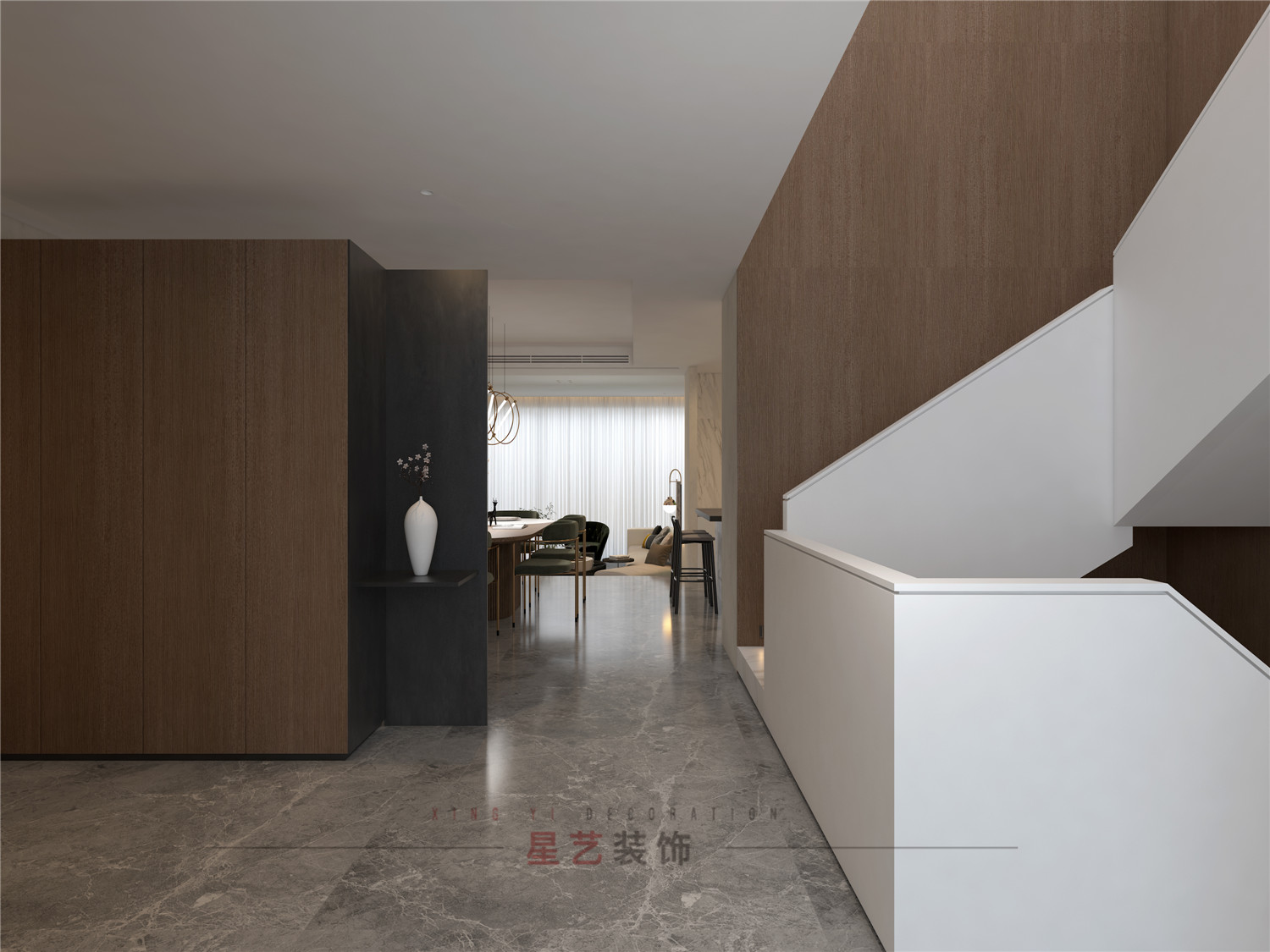 從玄關(guān)處用不同深淺的胡桃木配合黑白灰,