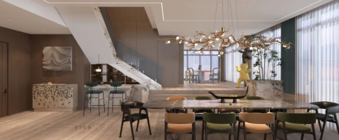 Leisure tea summer, the year stolen half of the old year; dining area, bar, shoe cabinets scattered, exquisite layout to build a style extraordinary quality of life; chandeliers designed to look like branches, light luxury and natural appropriate.