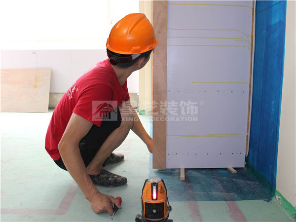 衣柜固定應用紅外線水平儀調平,再用木楔釘入確保穩固。